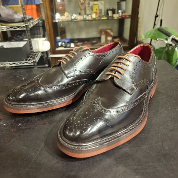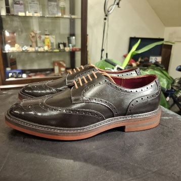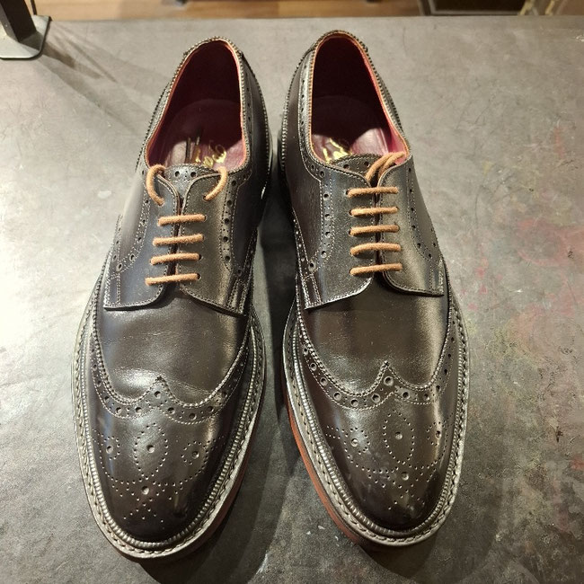 ご依頼の「ダークブラウン」へ生まれ変わったお靴をご覧ください。