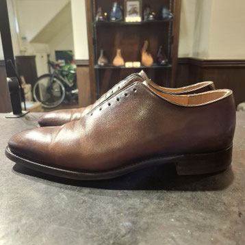 ブラウンカラーのホールカットデザインのお靴を人気の「染料黒染め」のご依頼です。